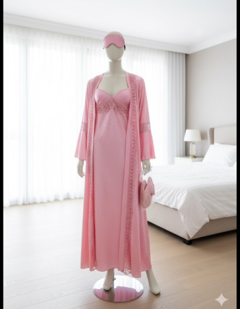 Satijnen jurk met transparante lange overjas en kanten details – Elegante avondkleding