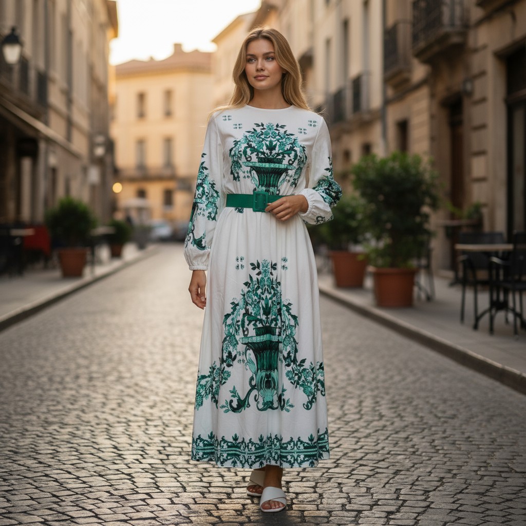 Danaden Lange Dames Jurk – Witte Maxi Jurk met Groene Print & Taille Riem – Elegante Niet-Doorschijnende Jurk – Chique Voorjaar/Zomer Outfit