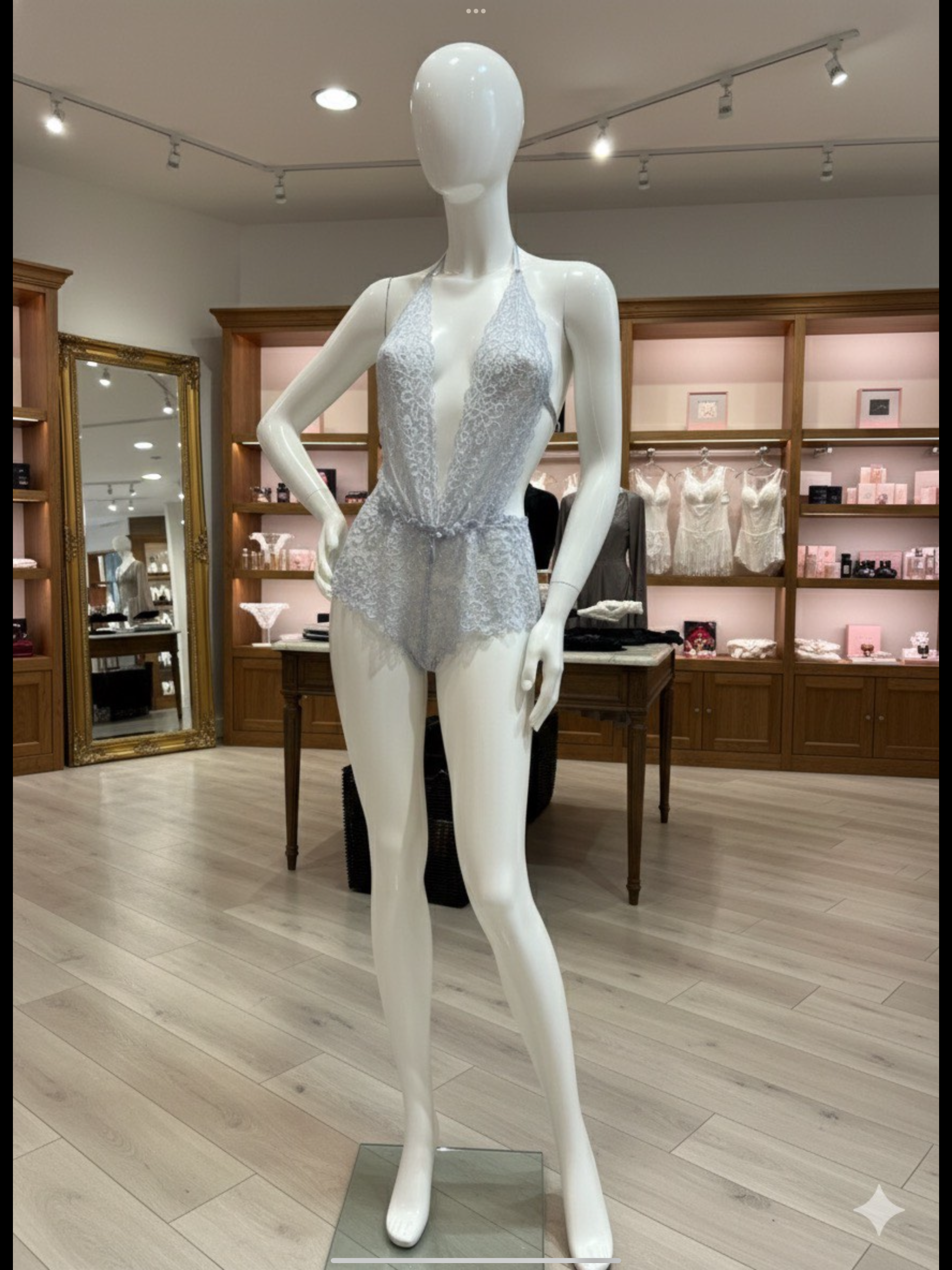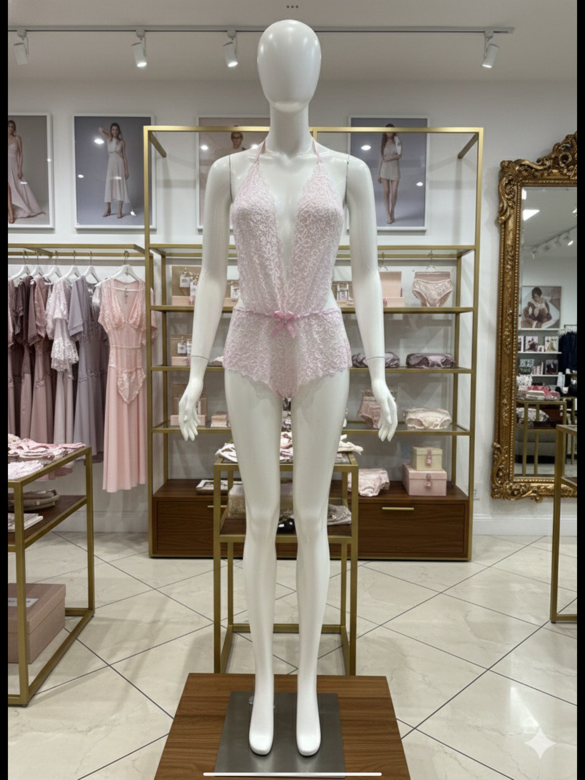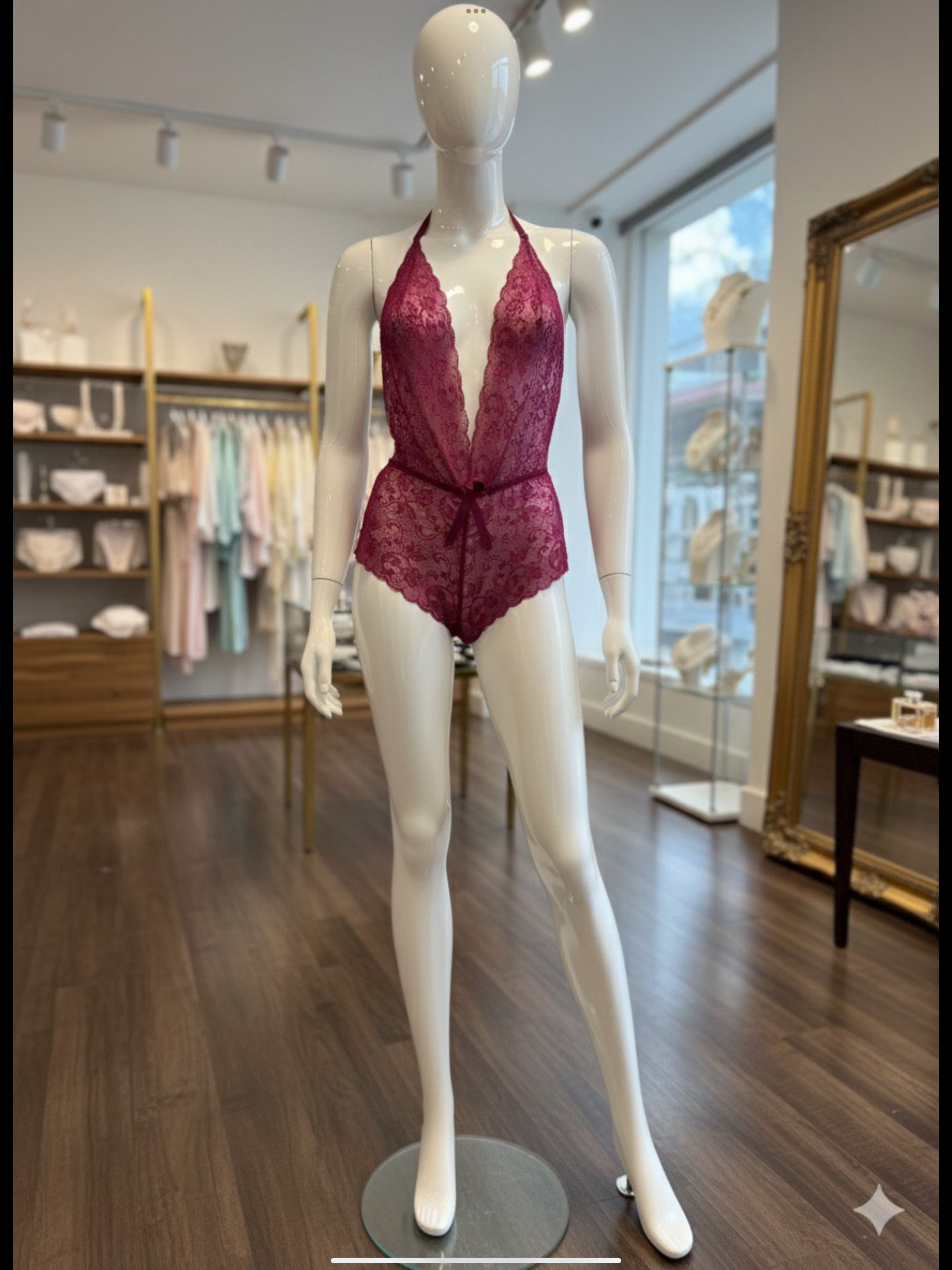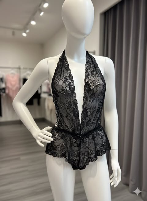 Deze ingewikkelde kanten halter-romper totale elegantie, comfort en vrouwelijkheid in één stijlvol ontwerp. De diepe V-hals, delicate kantstructuur en het subtiele detail in de taille creëren een prachtig silhouet dat zowel speels als sensueel aanvoelt.