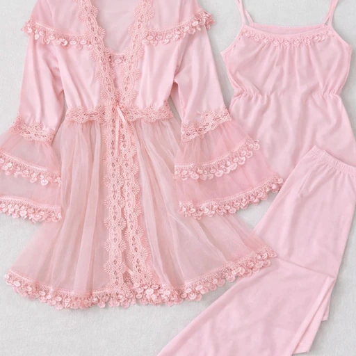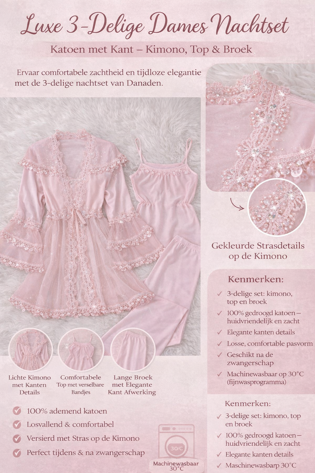 Luxe 3-Delige Dames Nachtset – Katoen met Kant & Strasdetails – Kimono, Top & Broek – Danaden Collectie