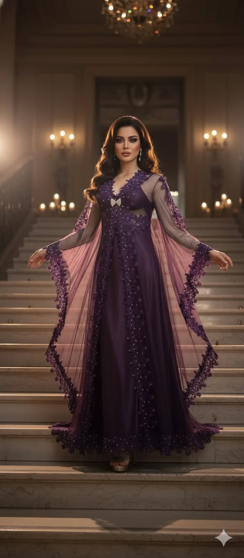 Deze betoverende paarse nachtjapon straalt luxe en elegantie uit. De jurk is gemaakt van een combinatie van zacht, doorschijnende tule en geheel kant , wat zorgt voor een romantische en mysterieuze uitstraling. De wijde mouwen met kanten afwerking en de lange dubbele pasvorm maken deze nachtjurk perfect voor speciale gelegenheden.