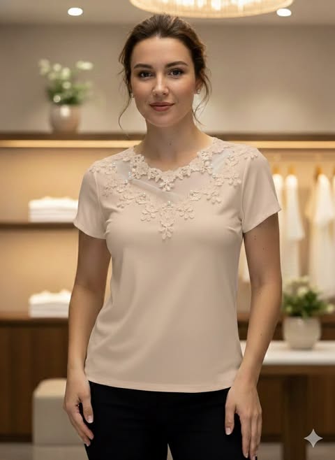 Dames T-shirt – Katoen met Stretch – Chiffon Halslijn met Parelversiering – Korte mouw