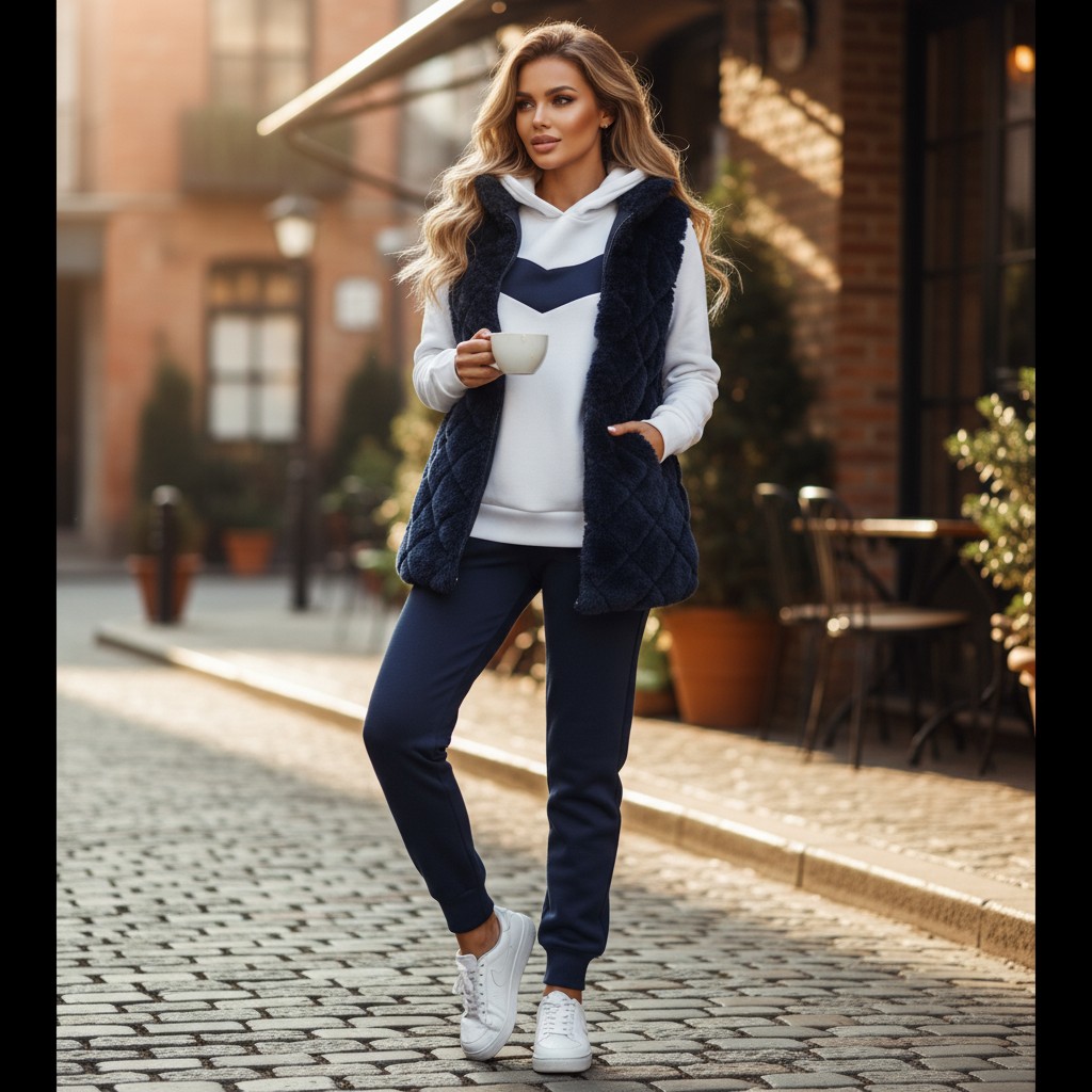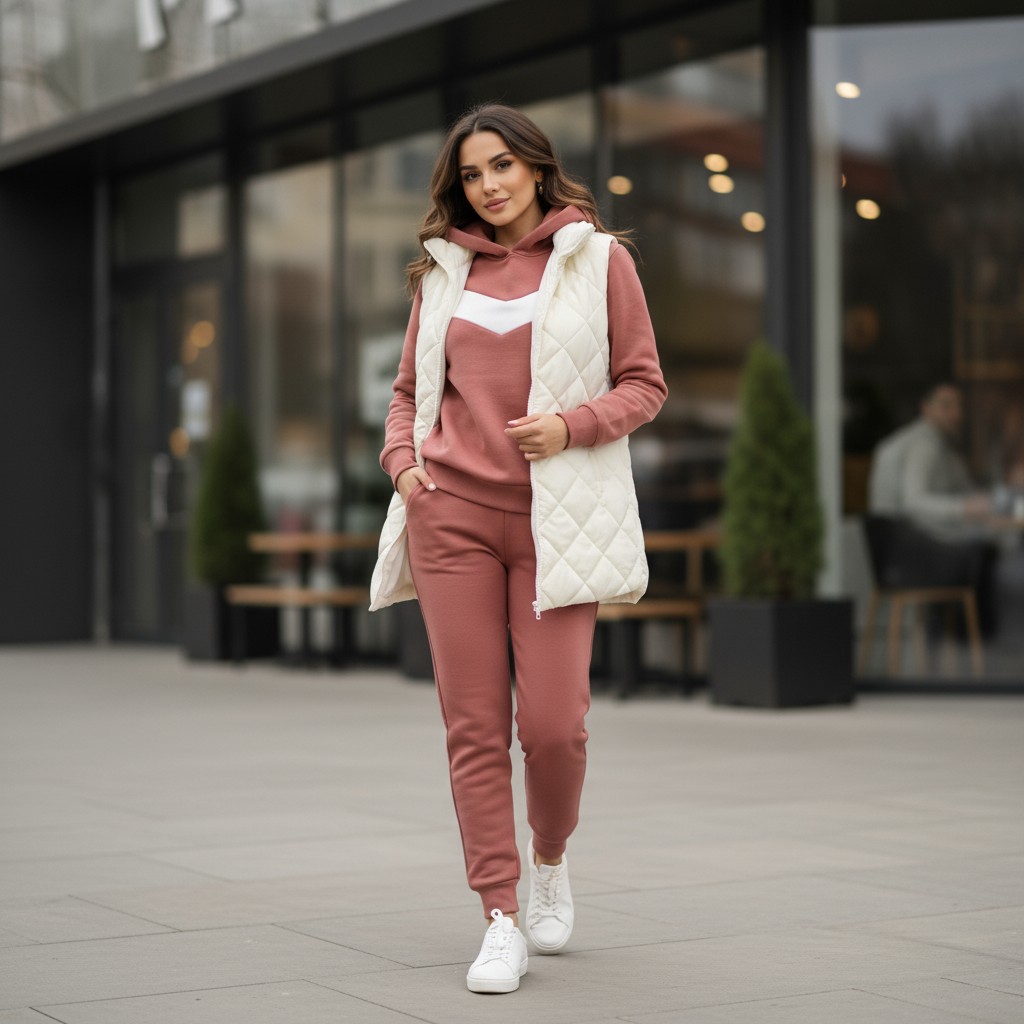 De set bestaat uit een zachte trui met moderne kleuraccenten , een comfortabele joggingbroek en een lichte gewatteerde bodywarmer voor extra warmte en flair.