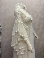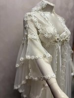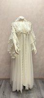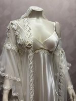Deze prachtige vintage witte nachtjapon is een echte eyecatcher voor romantische en stijlvolle momenten. De jurk is gemaakt van luchtige tule en satijnachtig materiaal , met ingewikkelde kantdetails langs de mouwen en voorkant. De wijde trompetmouwen geven een sprookjesachtige uitstraling, terwijl de lange, onmogelijke stof zorgt voor een elegante pasvorm.