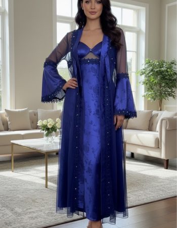 Satijnen jurk met transparante lange overjas en kanten details – Elegante avondkleding