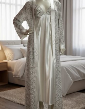 Maak uw nachtroutine nog aangenamer met deze luxe, zwarte satijnen nachtkledingset. Deze set bestaat uit een zacht hemdje, een bijpassende broek en een doorschijnende kanten kamerjas die een vleugje elegantie toevoegt.